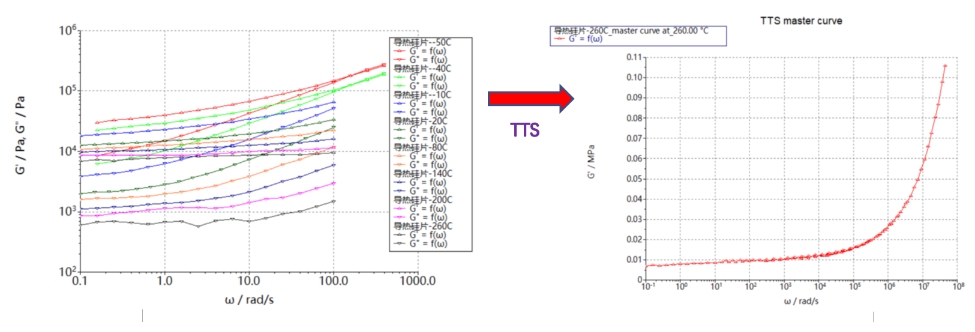 當(dāng)然我們除了可以進(jìn)行固定溫度點(diǎn)下的頻率掃描測(cè)試外,還可以進(jìn)行多個(gè)溫度點(diǎn)下的頻率掃描測(cè)試,然后根據(jù)時(shí)溫等效原理(TTS):低溫模擬高頻數(shù)據(jù),高溫模擬低頻數(shù)據(jù),最終經(jīng)過(guò)HAAKE RheoWin軟件處理計(jì)算獲得更寬范圍頻率的實(shí)驗(yàn)測(cè)試數(shù)據(jù)(如下圖)。